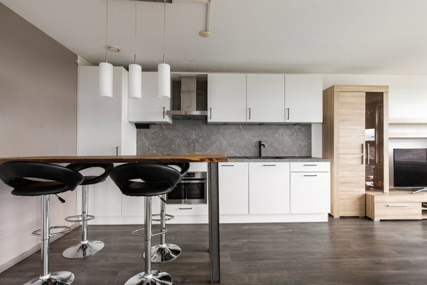 The modern open kitchen is fully equipped with high-quality built-in appliances and is ideal for cooking enthusiasts. Among other things, you have an induction hob, oven, dishwasher, and a spacious refrigerator with freezer compartment. The sleek finish and practical layout make the kitchen both stylish and functional.