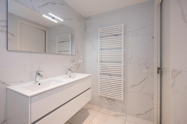 The living room is very spacious and bright with floor-to-ceiling windows with luze curtains. There is also a large, beautiful new bathroom with an extra large walk-in shower, a bathroom furniture with double sink and an extra radiator for the bath towels. There is a spacious inner storage room with the washing machine. From the living room you have access to the master bedroom with floor-to-ceiling windows and access to a fourth walk-in room that can be used as a work and dressing room.