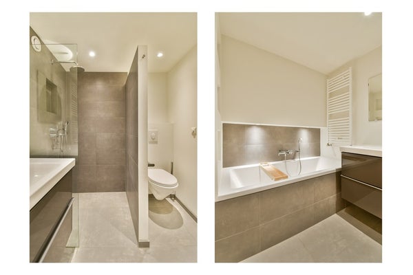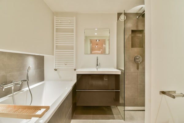 The bathroom has a toilet, walk-in shower, separate bath, double washbasin with design mirror and a design radiator.
