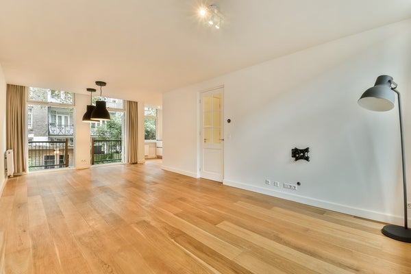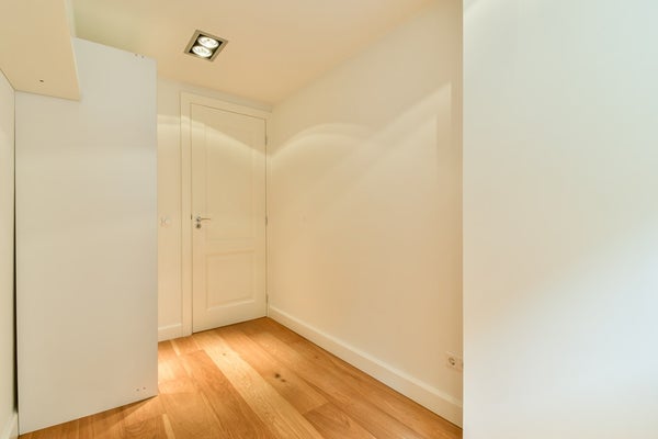 The living room is very light due to the large windows in front. At the backside you find the open plan kitchen with two double doors opening to the balcony that leads to the garden. Throughout the entire apartment lies a beautiful wooden floor.