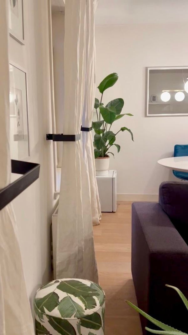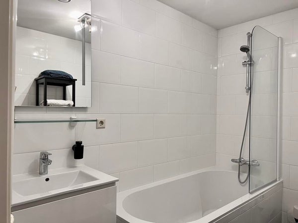 The inviting living space features a comfortable L-shaped sofa, ideal for relaxing or entertaining. The bathroom includes a bathtub, perfect for unwinding after a long day. A standout feature of this property is its two private outdoor spaces: a generous roof terrace and a balcony accessed directly from the living room—ideal for enjoying outdoor living in the heart of the city.