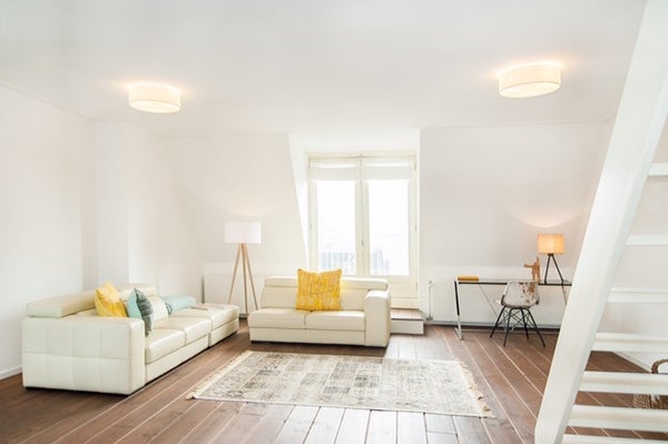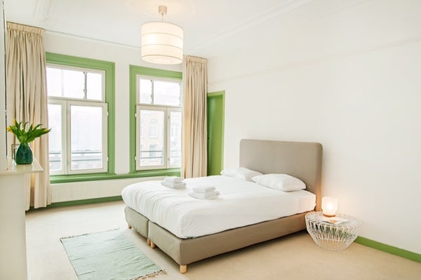 Penthouse with a beautiful view, located on the Overtoom in the center of Amsterdam, with an area of 160m2 and a private staircase. This furnished house is divided over two floors, with on the third floor two very spacious, light bedrooms and a slightly smaller room. The back bedroom also has a spacious balcony. The luxurious bathroom with a lovely bathtub, separate shower, spacious sink and toilet is also on this floor. The bathroom also includes a washer and dryer. On the top floor of the penthouse is the spacious living room with fantastic light invasion, oak flooring, modern furniture, with a cozy atmosphere and a terrace behind. Also on this floor is an additional toilet and the kitchen. The kitchen is equipped with modern appliances and has everything you need. The pearl of this penthouse is the spacious roof terrace that you reach from the living room. This property is very suitable for a family, a couple or to share. Well accessible by public transport and for your race bike and baby carriage, you can go to the spacious staircase that you use privately.