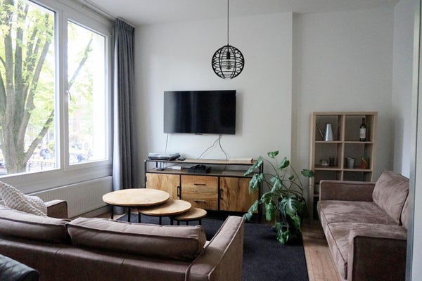 Living room with plenty of natural light thanks to the large windows at the front and a view of the canal. The high 3-meter ceilings, combined with the plastered walls and neat finish, create a spacious feel.