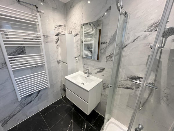 The luxury bathroom includes a shower, toilet, vanity, mirror, and heated towel rail.