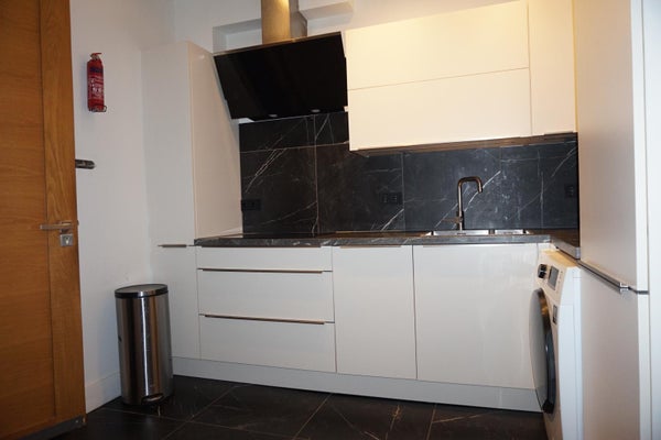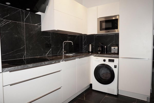 The luxury kitchen is equipped with all necessary built-in appliances, even a washing machine.