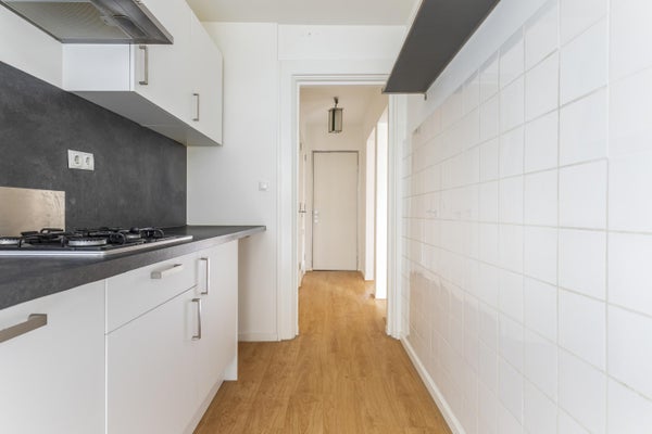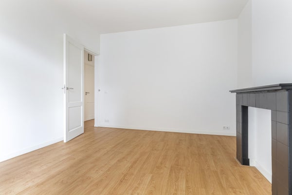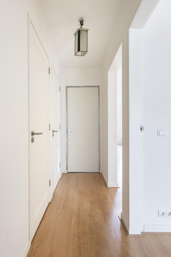 At the front of the apartment is the spacious living room of approximately 27 m². Thanks to the large windows and its canal-side location, this is a bright and pleasant living area with ample space for both a seating and dining area. From the living room, there is direct access to the balcony, creating a seamless connection between indoor and outdoor living.