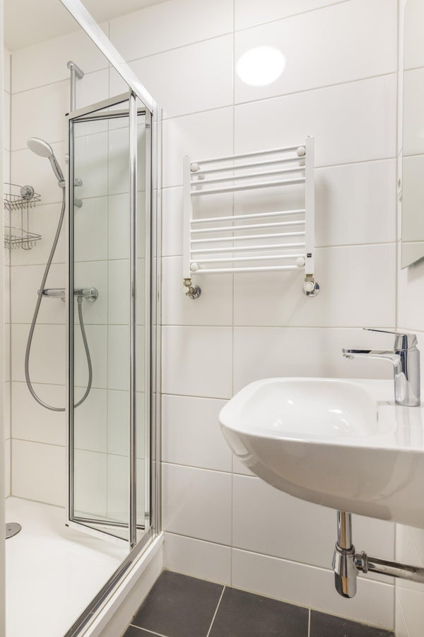 The apartment has two bedrooms. The main bedroom, located at the rear, measures approximately 15 m² and easily accommodates a double bed and a large wardrobe. The second bedroom is more compact at approximately 4.6 m² and is ideal as a home office, guest room, or child’s bedroom.