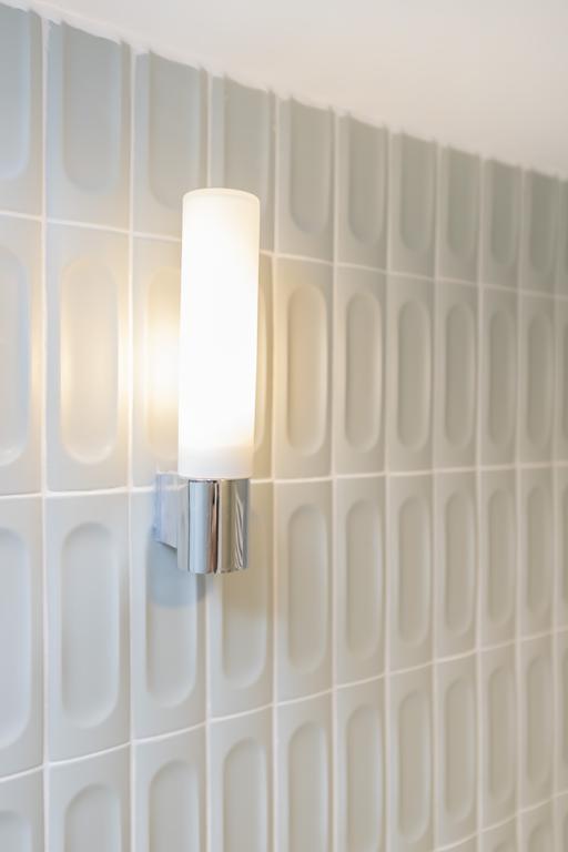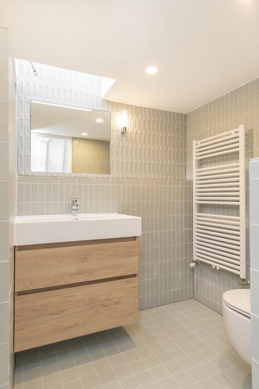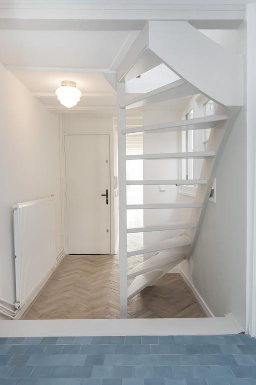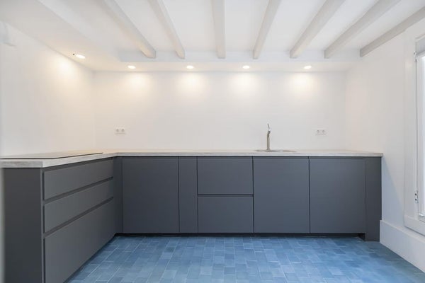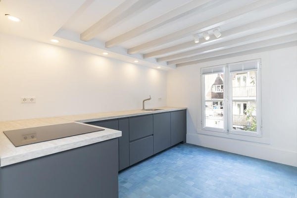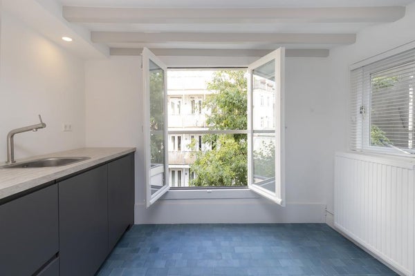 The modern open living kitchen is brand new, located at the rear of the apartment and has lots of windows. The unique blue tiles make the room domestic and there is enough space for a nice dinner table. Next to the kitchen, is the separate guest toilet.
