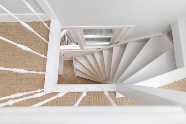Stairs to the top floor, a very open space, original beams, a modern bathroom and the roof terrace.