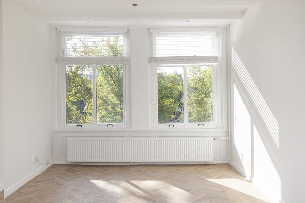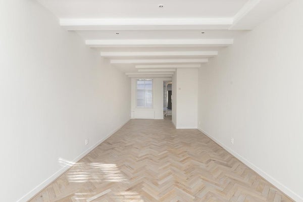 The bright living room has an amazing view, beautiful window coverings and is very spacious. The wooden herringbone floor has just been placed and matches perfectly with this characteristic apartment.