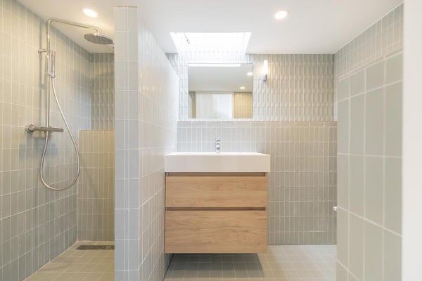 The beautiful bathroom with gorgeous tiles is located in the middle of the floor and features a skylight, walk-in shower, sink with drawers and a toilet.