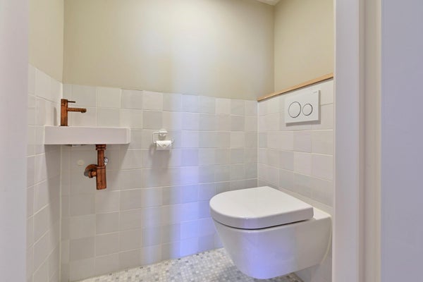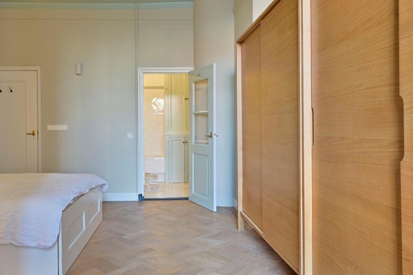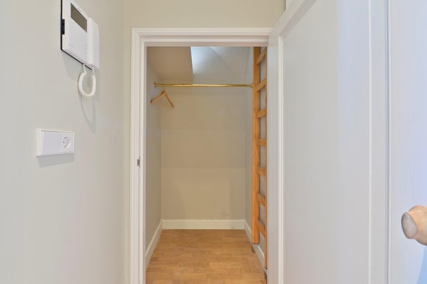The spacious bedroom features a double bed and ample wardrobe space. Adjacent is the authentic bathroom, fitted with a shower, bathtub, double washbasins, washing machine and sufficient storage space. There is also room for installing a dryer. The apartment further offers a separate toilet accessible from the hallway. Above the toilet is a practical storage area, reachable via two opening hatch doors.