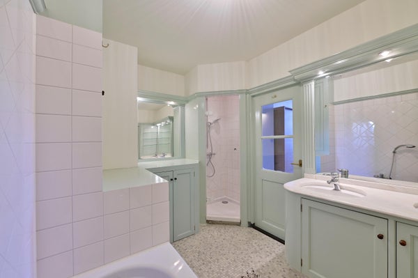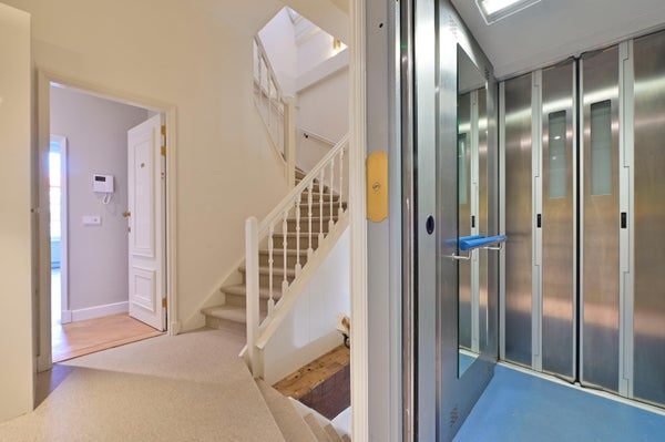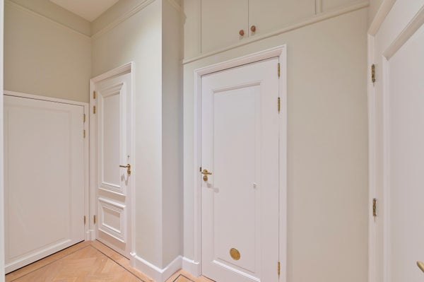 The apartment is accessible via the monumental entrance and stately staircase, either by stairs or elevator. The bright living room with open-plan kitchen is tastefully furnished and equipped with built-in appliances including an induction hob, oven and dishwasher.