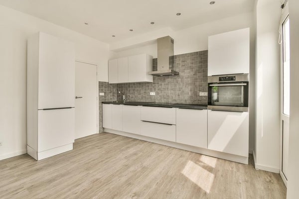 On the left-hand side, there is a second bathroom with the same layout. You will also find a bright living room with an open-plan kitchen. The kitchen is equipped with, among other things, an oven/microwave combination, refrigerator, freezer, and a four-burner electric hob. There is also a utility room fitted with a new washer-dryer combination.