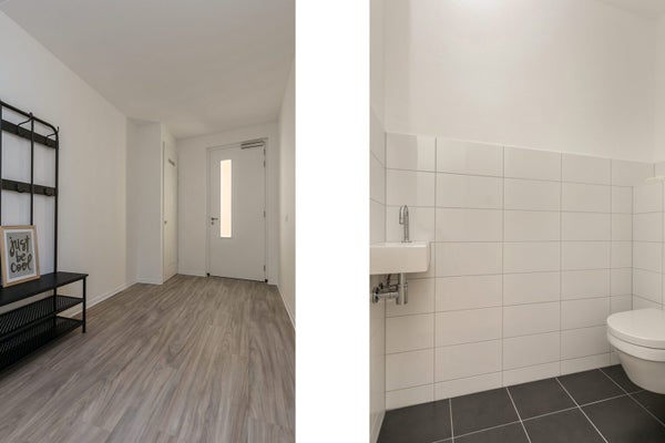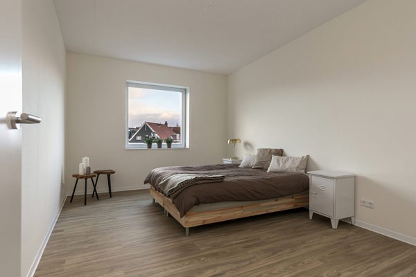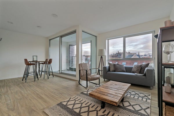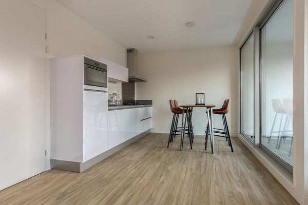 Experience the city's dynamic lifestyle with this luxury 3-room apartment on the 4th floor of the "Bartok" complex, located at Bartokplein in the vibrant heart of Arnhem. Entering through a spacious hall, you find the bright living room with a balcony and an open kitchen, equipped with built-in appliances such as a gas stove, refrigerator, combi microwave, and dishwasher. The bathroom features a washbasin, walk-in shower, and a bathtub, alongside two bedrooms, a separate laundry room, and a toilet with a washbasin. The apartment includes underfloor heating and a stylish PVC floor with a wood look. There is a bicycle storage in the basement, and a parking permit can be applied for. The service costs are €45 per month, with a minimum rental contract of 1 year.
