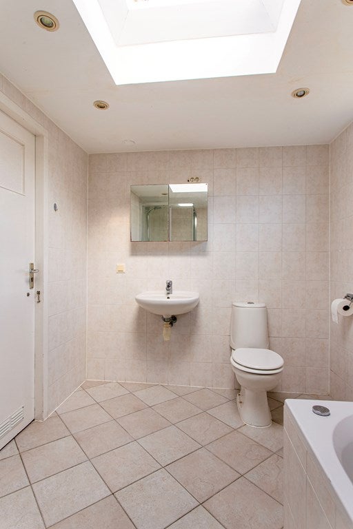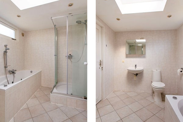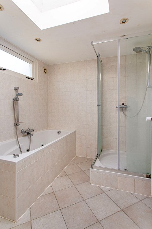 The comfortable bathroom is spacious and equipped with a bathtub, separate shower, sink, and a second toilet. Furthermore, the property also has a basement.