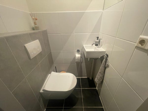 You can reach the first floor via the fixed staircase where you will find the spacious living room with open kitchen, the toilet, and an extra (work) room. There is also a separate area with the connection for the washing machine.