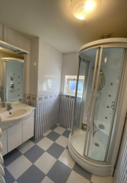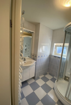 The second bedroom leads to a sunny northwest-facing balcony. The bathroom, with a shower, washbasin with vanity unit, and towel radiator, is also located on this floor. Adjacent to the bathroom is a laundry/storage room with connections for a washing machine and dryer.
