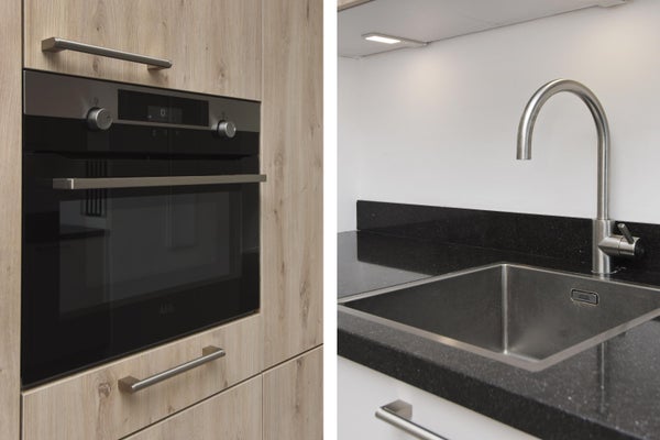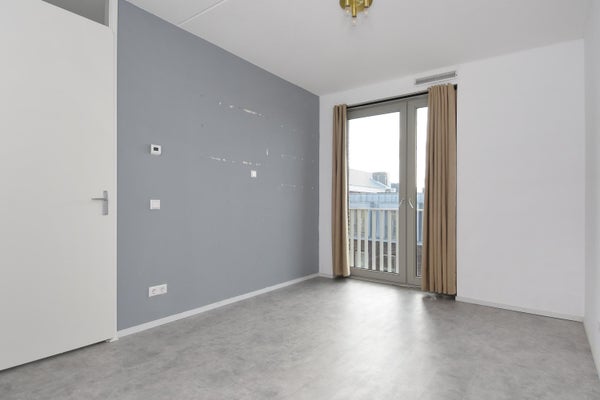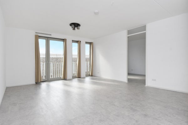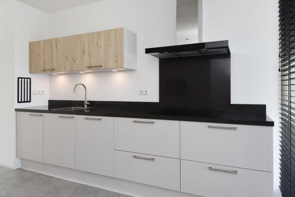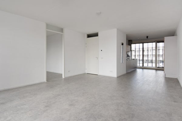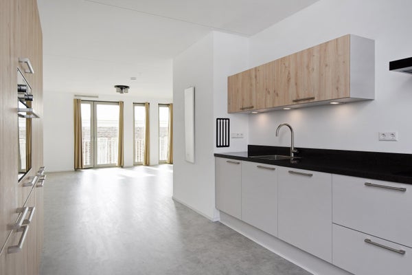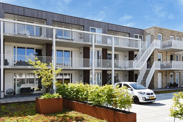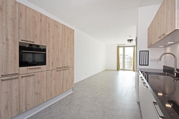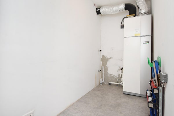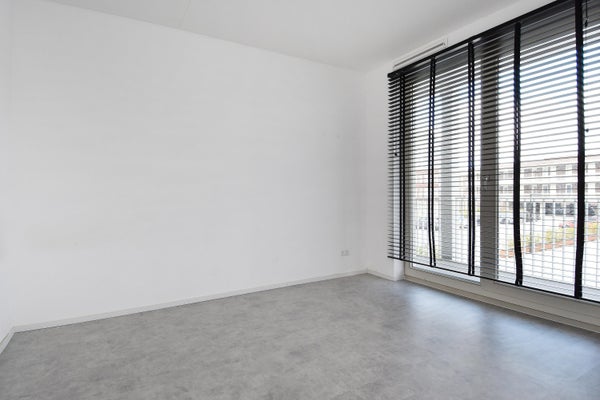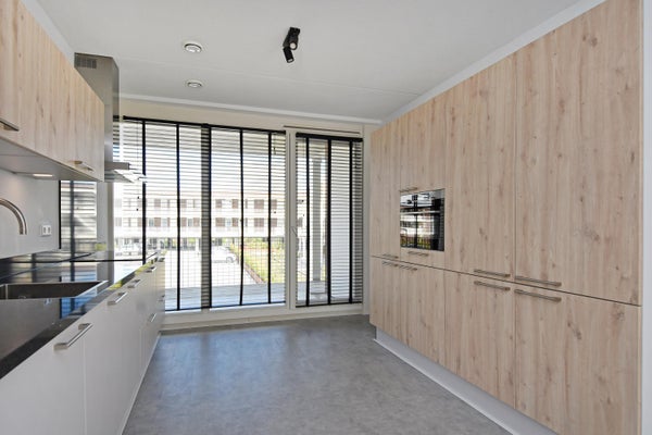 Entrance/hall with meter cupboard, toilet, access to the second bedroom, laundry room, bathroom, and living room. The spacious living room has an open kitchen, equipped with various built-in appliances such as a combination oven, fridge-freezer, dishwasher, and induction cooktop with extraction. The two bedrooms are located on the other side of the apartment; the largest bedroom is approximately 16 m² and the small bedroom about 10 m². The bathroom features a sink and walk-in shower. The laundry room is located next to the bathroom.