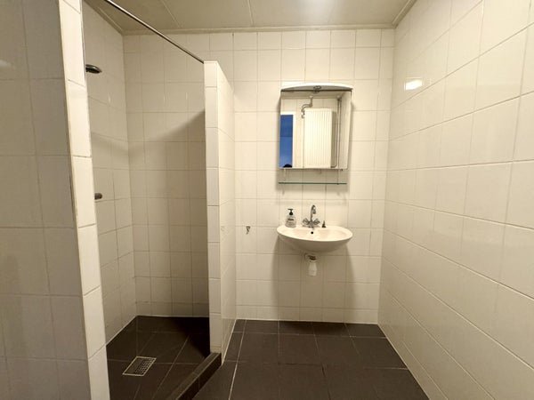 The neatly tiled bathroom has a comfortable walk-in shower and a beautiful washbasin with mirror cabinet. There is a separate, neatly finished toilet in the hall.