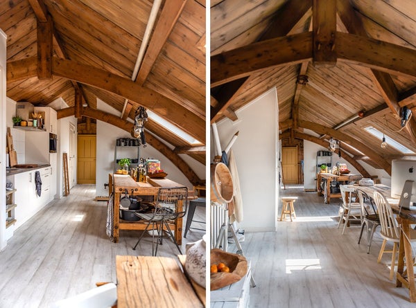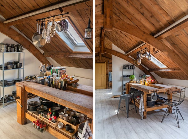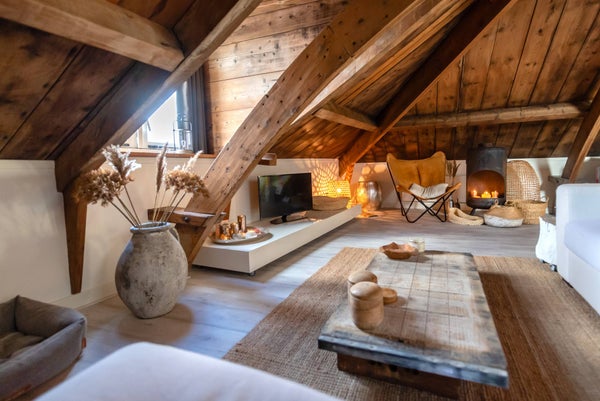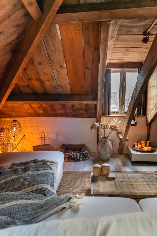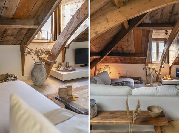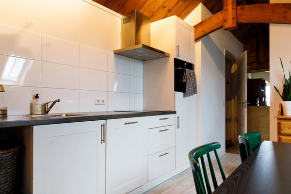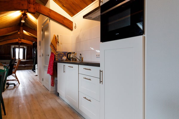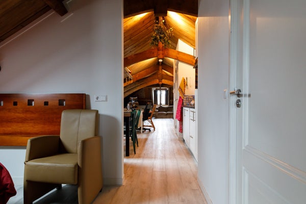 On the top floor (2nd), the last apartment was completed in August 2019, which might be better described as a loft. Through the common hall with beautiful marble floors and the communal staircase, you will find your front door on the 1st floor of the complex. Behind the front door, there is a staircase leading you to the 2nd floor where you enter the very spacious, bright, and especially cozy living room. Thanks to the unique roof construction that has been preserved and is also visible, the room has a unique look. Due to several Velux windows and the fact that few doors have been placed in the apartment, the space is very light.