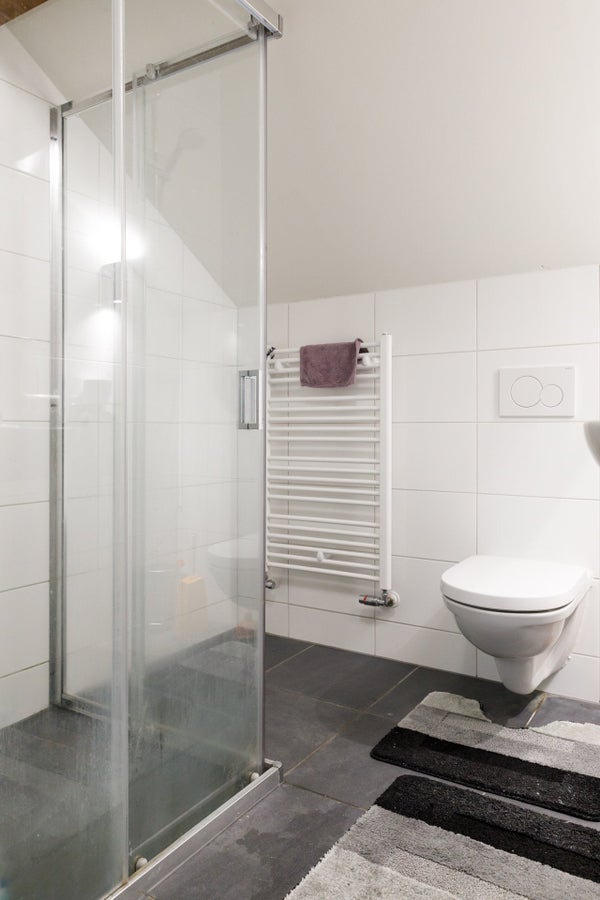 The bathroom is accessible through the bedroom and is equipped with a sink, toilet, shower, and designer towel radiator.