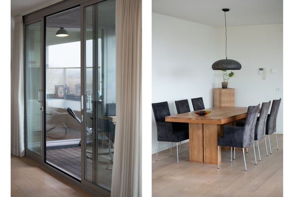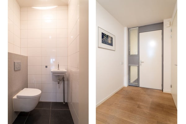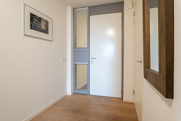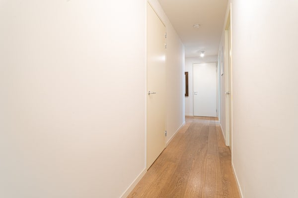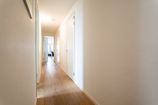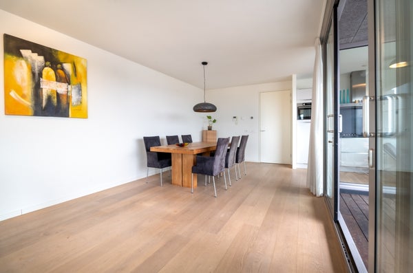 Entrance/hallway, with intercom, the toilet , access to the bedrooms, laundry room, bathroom and living room. The entire flat has a beautiful wooden floor, stucco wall and ceiling finishes. Toilet, tiled, with floating toilet, sink and ventilation. Living room, with open kitchen. From the living room there is access to the loggia. Because of the many windows, the living room is a nice and light room. Open kitchen, L-shaped, with composite worktop, fridge, gas hob, extractor, stainless steel sink, combi oven/microwave and dishwasher. The kitchen has an extra window giving you a beautiful view. Bedroom I, located at the front. Bedroom II, located at the front. Bathroom, indoors, fully playfully tiled, with bath, walk-in shower, double washbasin with cabinet and ventilation system. The laundry room houses the washing machine, dryer and an extra fridge freezer.