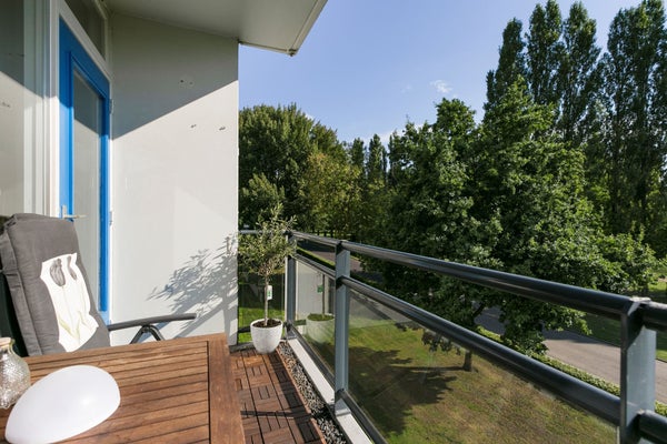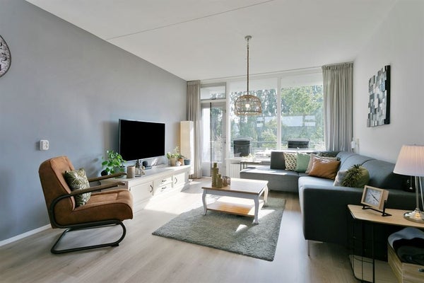 De royale woonkamer is voorzien van laminaat en de wanden zijn afgewerkt met stucwerk. Vanuit de woonkamer is toegang tot het balkon.