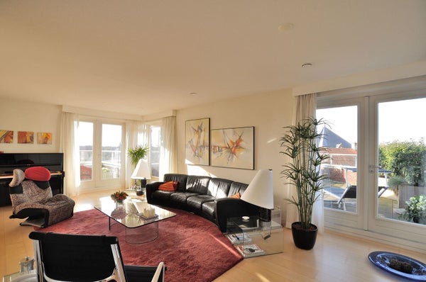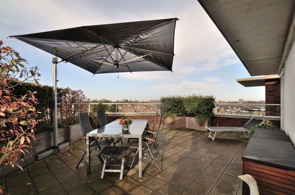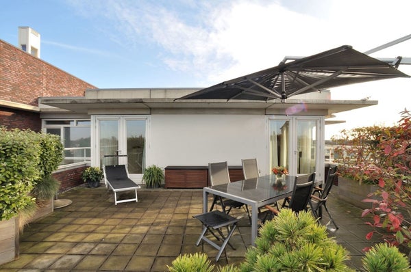 Layout: Hall/entrance with videophone, meter cupboard, separate (floating) toilet, an indoor storage room with HR combi boiler, washing machine and dryer, spacious living room of approx. 81m² with French doors to the large roof terrace of over 40m2 and a door to terrace 2, kitchen of approx. 15m2 equipped with all appliances and a door leading to terrace 3 (approx. 7m²), two bedrooms of approx. 8 and 16m2 and a bathroom with sink and shower.