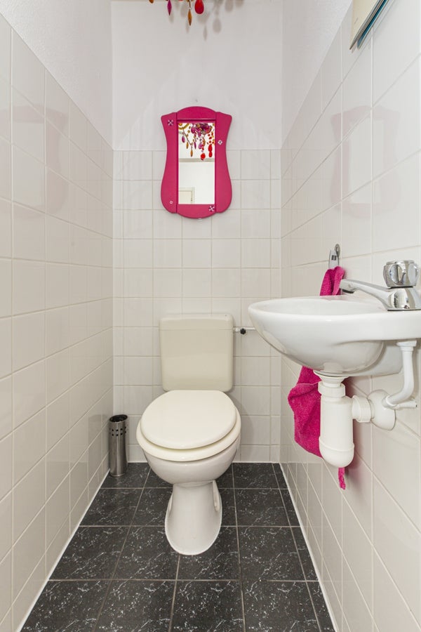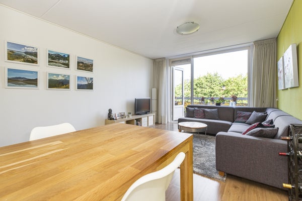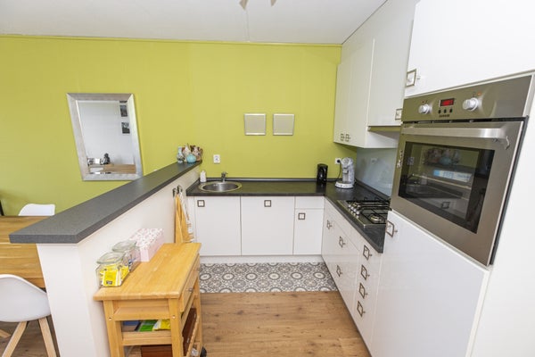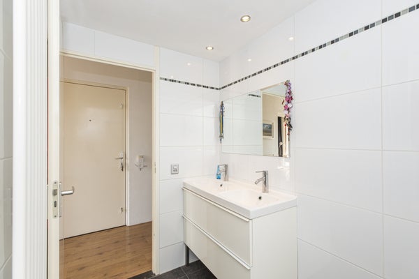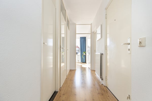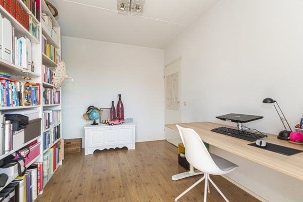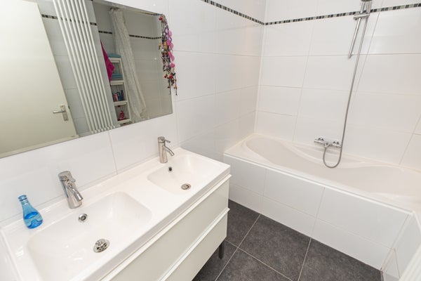 Through the front door you reach the hallway which provides access to all rooms in the house. The floor has beautiful flooring. Through a door you have access to the balcony. Also here is the open kitchen. The kitchen has many cabinets, a gas hob, extractor, dishwasher and fridge freezer. The beautiful bathroom is equipped with a lovely bathtub and a nice washbasin. The walls are tiled and there is a mechanical extractor installed. In the spacious storage room is the central heating boiler and mechanical ventilation placed. The bedroom and office are located at the quiet rear and is also equipped with a beautiful floor and a balcony.