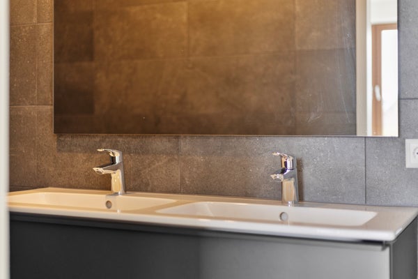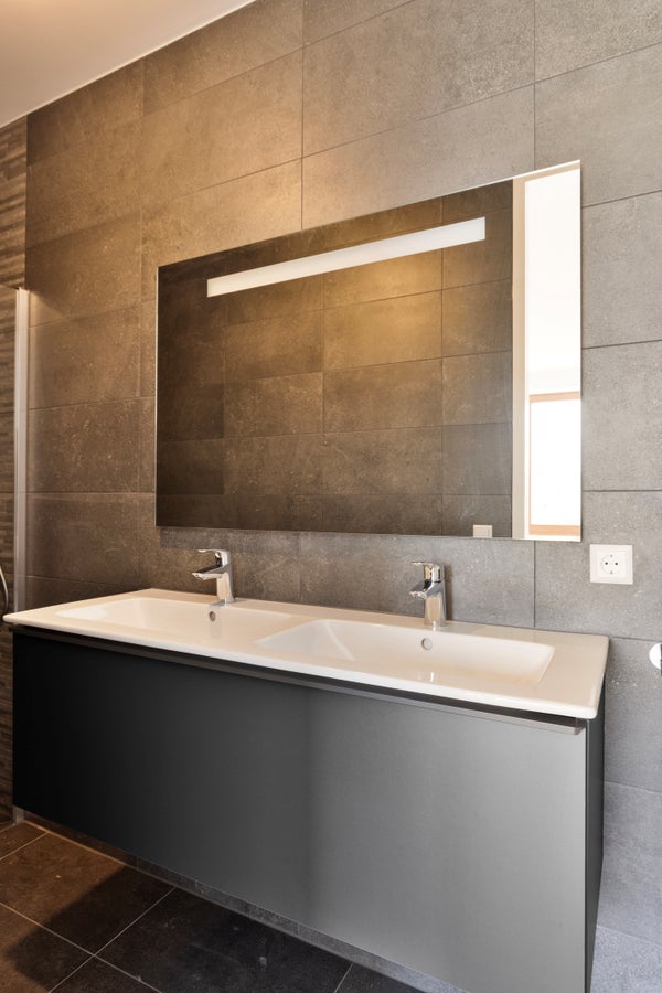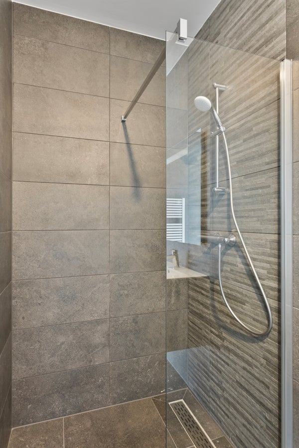 The bathroom (approx. 4 m²) is fully tiled and spacious in layout. There is a spacious walk-in shower with a drainage channel, two sinks, and an electric designer radiator.