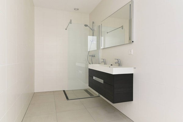 The bedroom comfortably accommodates a double bed and a generous wardrobe. The bathroom is sleek and contemporary, fitted with a walk-in shower and a washbasin with mirror. In addition, there is a separate toilet with a small sink, accessible from the hallway.
