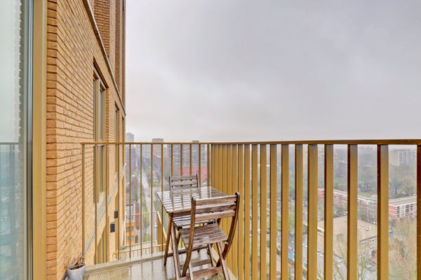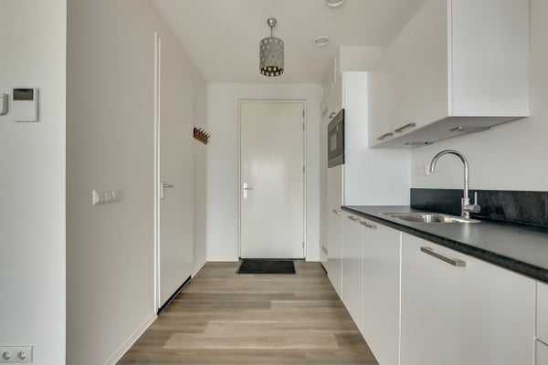 Located on the seventeenth floor of a carefully maintained apartment complex on the edge of Delft’s historic center, this upholstered studio-apartment offers an excellent standard of living. Thanks to its elevated position, the apartment enjoys stunning unobstructed views and abundant natural light. The studio features a stylish living space with an open kitchen, equipped with high-quality built-in appliances. The modern bathroom is fully fitted and luxuriously finished. The apartment meets contemporary comfort and sustainability standards: it is gas-free, well insulated, and equipped with an energy-efficient heat pump system. The location is particularly convenient: the vibrant city center—with shops, restaurants, and cultural amenities—is just a short bike ride away. The apartment is also directly adjacent to the De Hoven shopping center, and the TU Delft campus is easily accessible by bike. Rent is € 1.155,- per month excluding