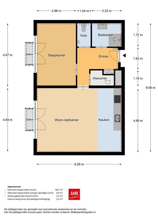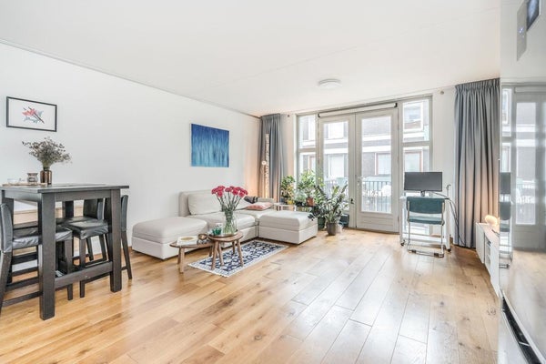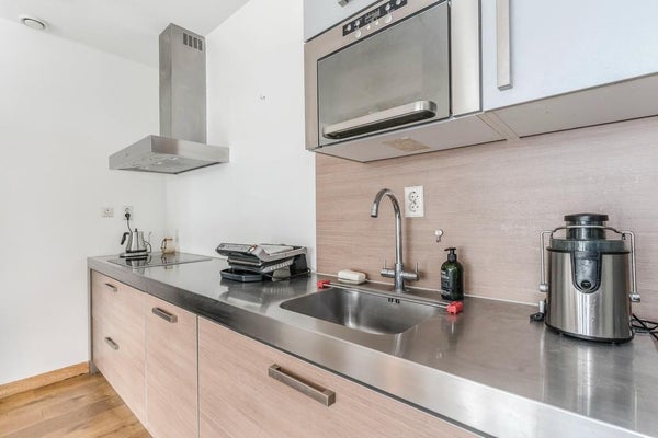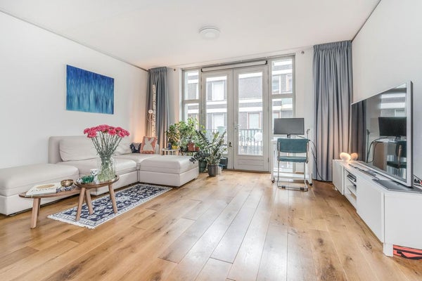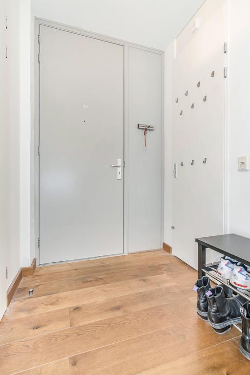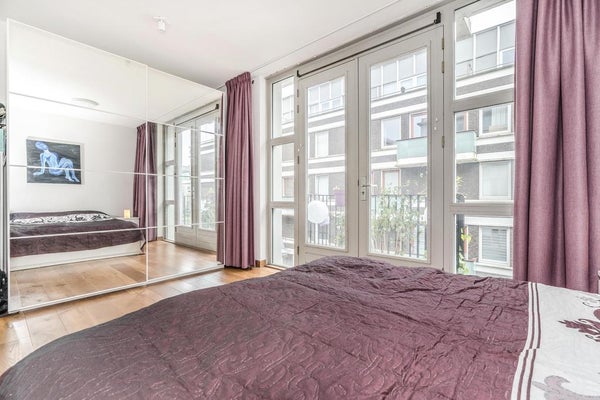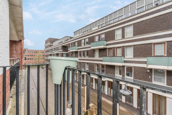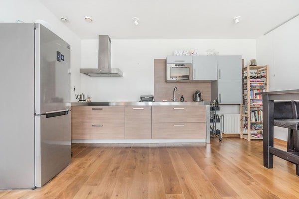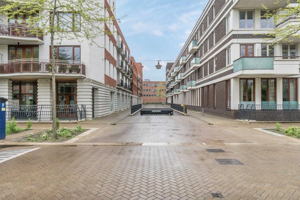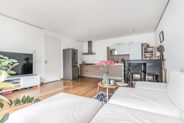 This spacious and bright 2-room apartment is located in the sought-after Paleiskwartier on the education boulevard. The new neighborhood features a modern design and offers a mix of living and working with amenities such as higher education, offices, and a city park. Within walking distance are the central station and nature reserves. The apartment is on the second floor of a high-quality building, equipped with cold and heat storage for sustainable energy. The hallway provides access to the living room with wooden flooring and double doors to a balcony. The kitchen features Whirlpool appliances. The spacious bedroom has doors leading to a second balcony, and the bathroom includes a shower and sink unit. Additionally, there is a shared inner garden and a storage room in the basement.