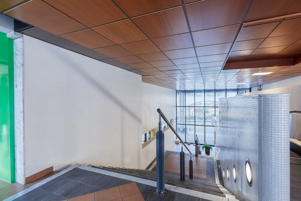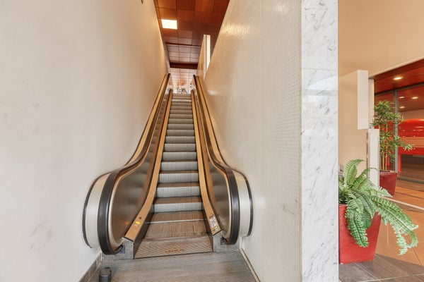Secure entrance at street level with doorbells and mailboxes. Staircase or elevator to the ninth floor.