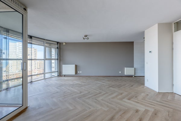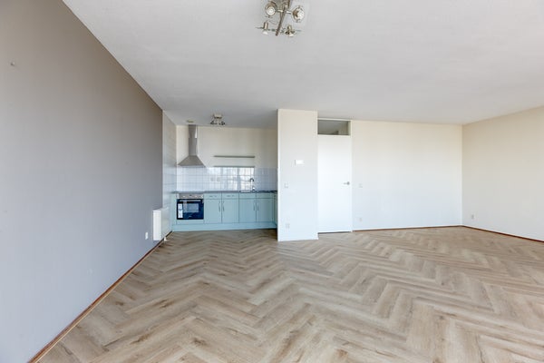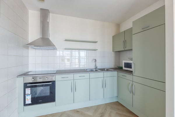 The generous and bright living room is finished with a beautiful herringbone PVC floor. The floor-to-ceiling windows offer exceptional views over Scheveningen. The enclosed loggia provides a wonderful space to enjoy these views; the windows can be fully opened to create a pleasant outdoor feeling. The open kitchen is fully equipped with the necessary built-in appliances, including an induction cooktop with extractor hood, oven, microwave, refrigerator and freezer.