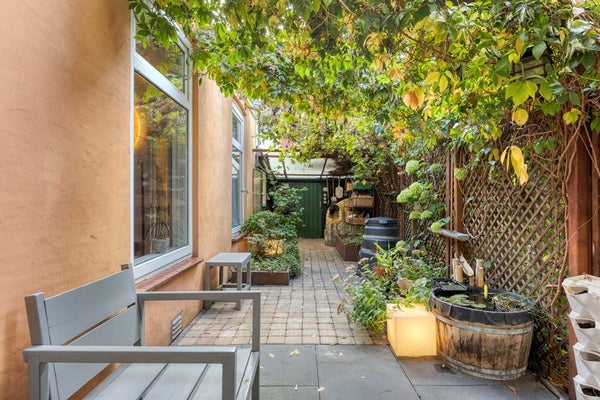 From the kitchen, you enter the charming bedroom, featuring a window that brings in lots of natural light and offers a view of the lush garden.