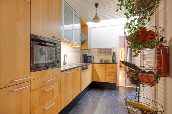 From the living room, you also have access to the fully equipped kitchen, which includes an induction cooktop, extractor hood, microwave, oven, dishwasher, and fridge.