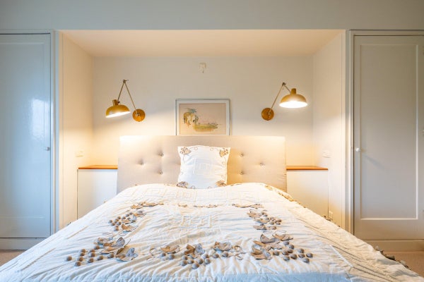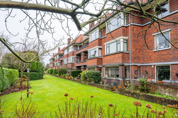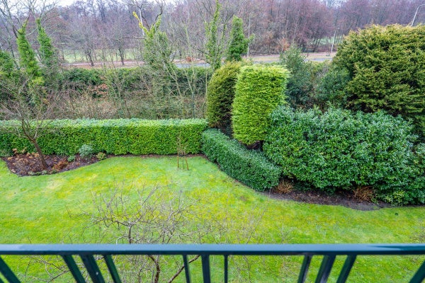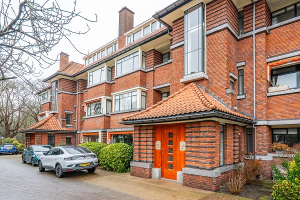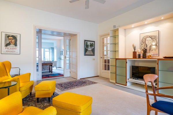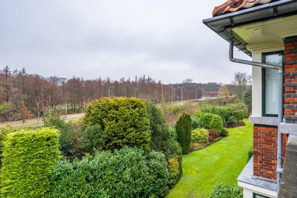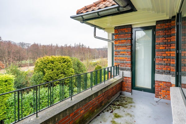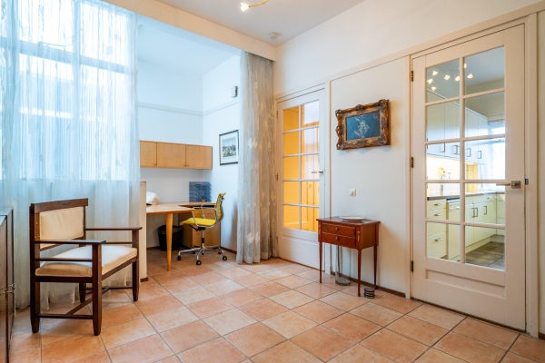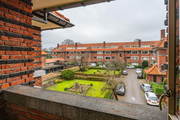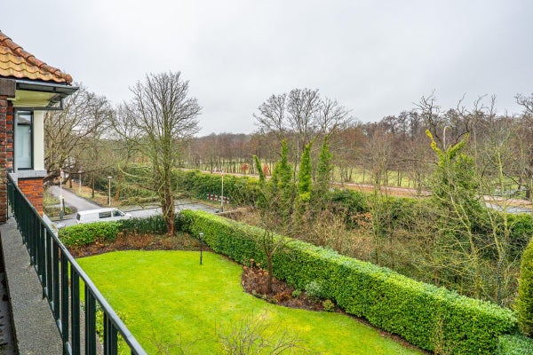 The living room, with a fireplace and access to the spacious balcony with evening sun, offers a beautiful and unobstructed view of the greenery towards Duindigt. The authentic en-suite sliding doors with practical built-in cupboards have been retained.