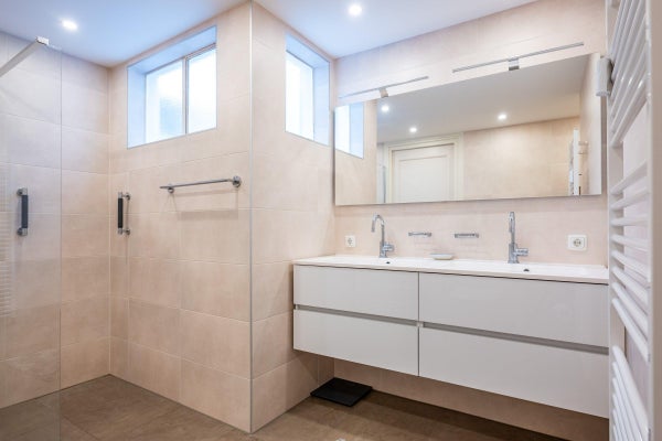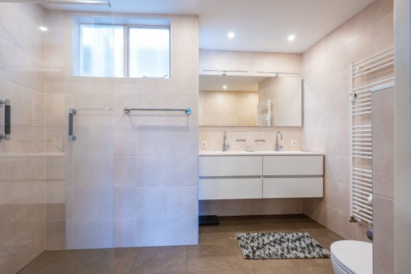A spacious, modern bathroom with a walk-in shower, wall-mounted toilet, and double vanity. The bathroom is accessible from both the bedroom and the hallway.