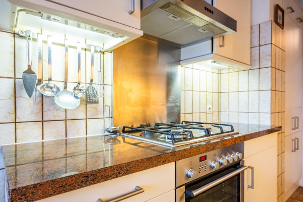 Separate kitchen with access to the second balcony at the front. The kitchen is equipped with all desirable built-in appliances, including an oven, microwave, dishwasher, gas cooktop, extractor hood, and fridge-freezer.