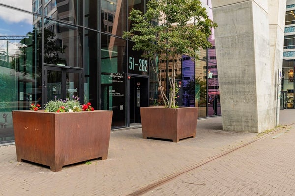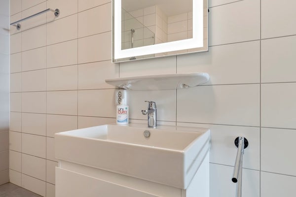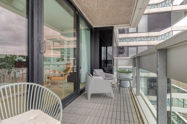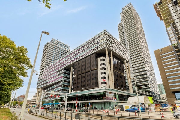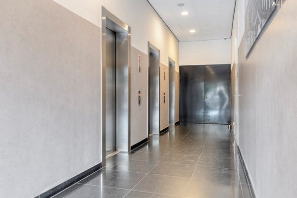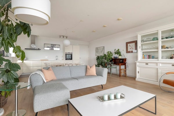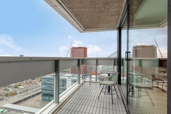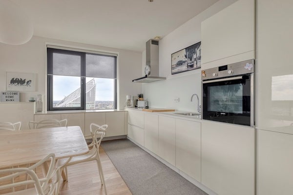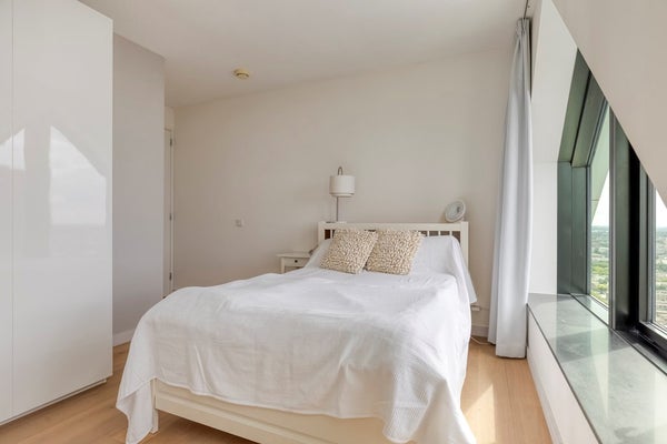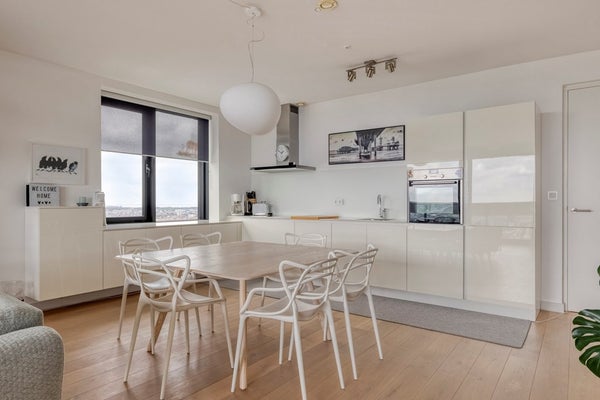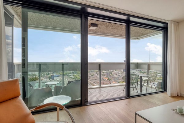 The large glass doors in the living room provide access to the balcony with a stunning view of the city of The Hague. Here you can relax with your morning coffee, enjoying a view that is anything but boring.