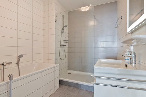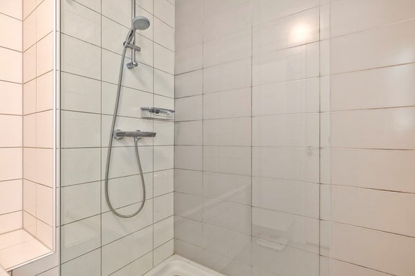 The spacious bathroom offers plenty of comfort with a large shower and a relaxing bathtub, perfect for unwinding after a long day. It also features a modern sink and ample cabinet space to neatly store all your toiletries and essentials.