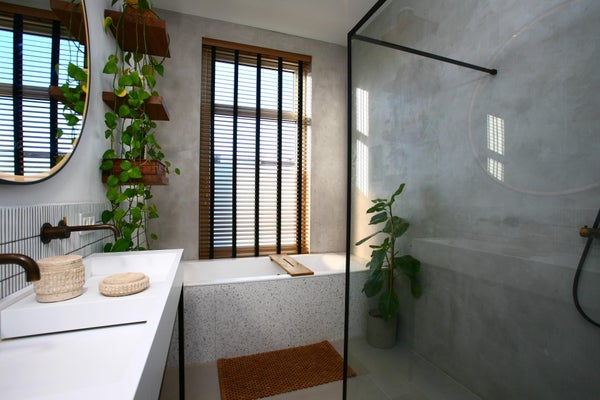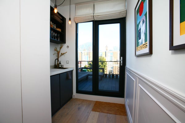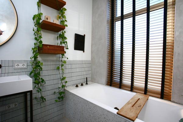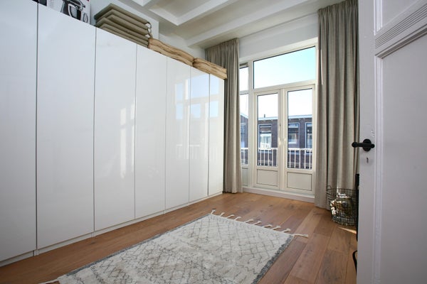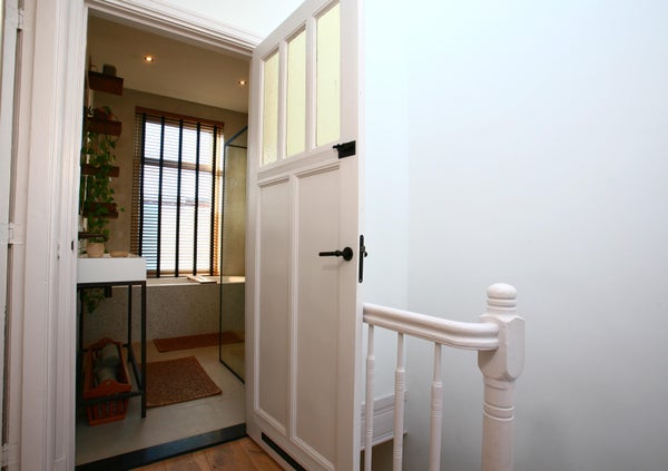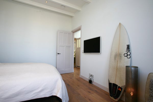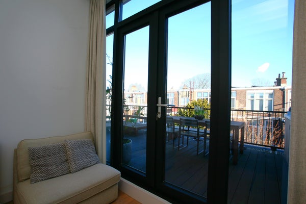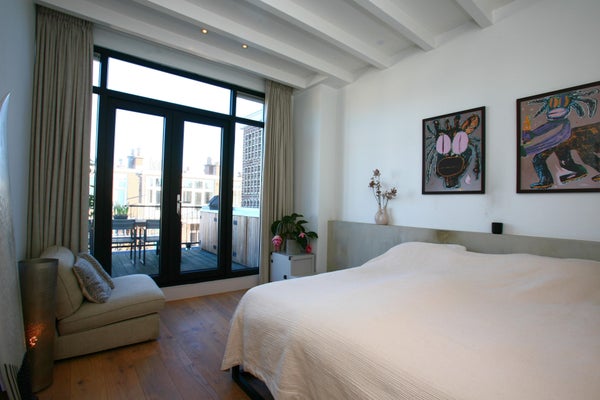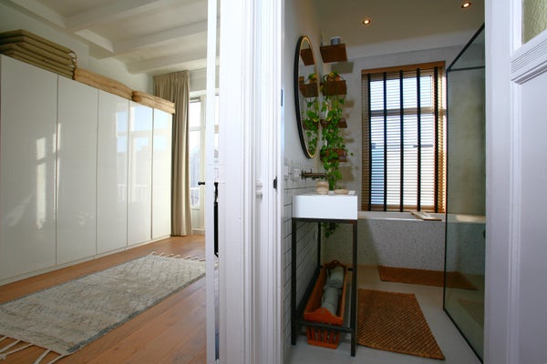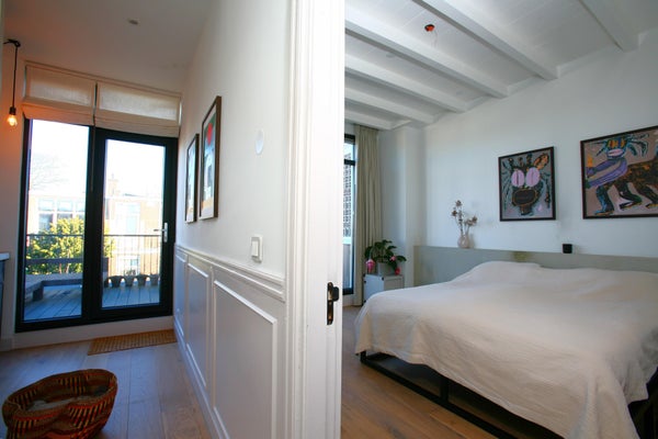 On the second floor is a large, bright master bedroom with an adjacent sunny terrace. The bathroom has a bathtub, walk-in shower, and sink. Toilet is separate.
