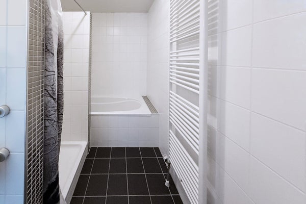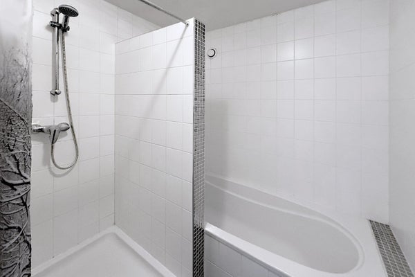 The bathroom is fitted with a bathtub, separate shower, and washbasin.
