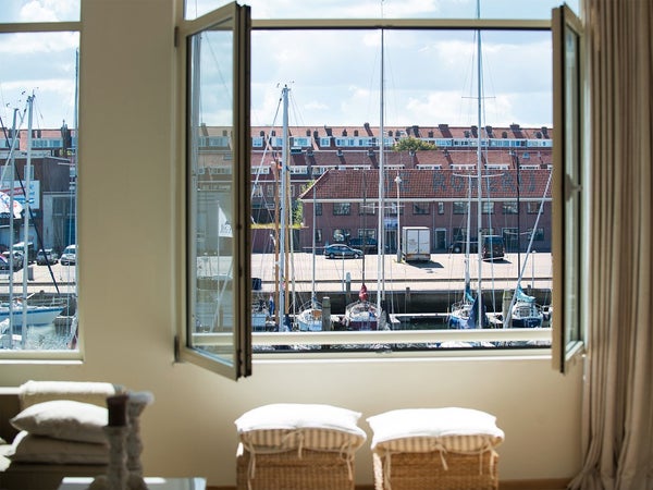 Continuing into the property, the bedroom is arranged to create a calm and restful atmosphere. From here, you can once again enjoy the beautiful views of the boats in Scheveningen’s harbour, making it the perfect place to wake up.