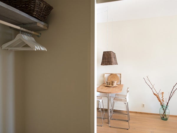 Upon entering the furnished property, you are welcomed into a spacious hallway that provides access to the generous living room with open-plan kitchen, the bedroom, the bathroom, and a separate guest toilet.