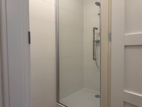 The second bathroom has a walk-in shower. There is a separate room for the washing machine and dryer. There is also a separate toilet.