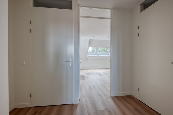 This comfortable apartment of approx. 65 m² is located on the second floor and offers a smart, efficient layout with a surprisingly spacious feel. The living room is located at the rear and opens onto a sunny northeast-facing balcony of approx. 7 m². At the front are two charming bedrooms with dormer windows, a modern bathroom, a separate toilet, a private storage unit, and a private parking space. The architecture, featuring natural red roof tiles, white wood accents, and warm bricks, blends beautifully with the surrounding buildings.