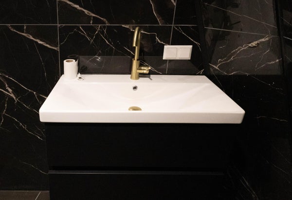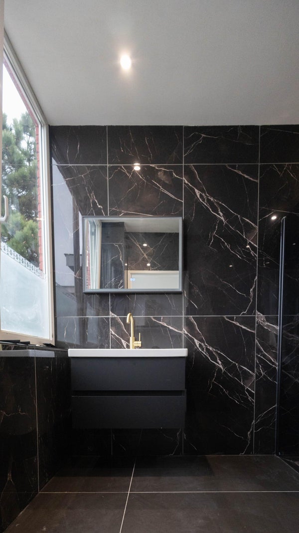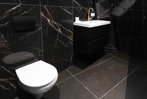 The staircase takes you to the second floor. Here, the landing gives access to a second, modern bathroom with a wall-mounted toilet, washbasin, towel radiator and walk-in shower.